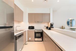 L'appartamento spazioso comprende due camere da letto e due bagni provvisti di vasca da bagno, doccia, bidet, prodotti da toilette omaggio tra cui shampoo e balsamo, oltre ad asciugacapelli. Gli ospiti possono usufruire di un angolo cottura completamente attrezzato con piano cottura, forno, lavastoviglie, frigorifero, microonde e bollitore elettrico insieme agli utensili per cucinare al meglio. Il comfort in camera include aria condizionata, lavatrice, TV a schermo piatto, aree salotto con divano nonché extra come ferro da stiro e scrivania.