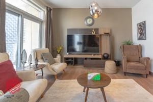 This spacious unit comes with two bedrooms and two bathrooms equipped with bathtubs and bidets. Guests can relax in the seating area which includes a sofa and enjoy entertainment on the flat-screen TV. The fully equipped kitchen contains a stovetop, refrigerator, dishwasher, oven, microwave, toaster, electric kettle as well as tea and coffee making facilities alongside a dining table for convenience.