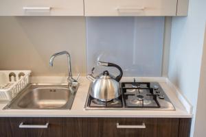 Este estudio con aire acondicionado incluye una cama y una cocina americana totalmente equipada con horno, placa de cocina, microondas, refrigerador, tostadora, hervidor eléctrico y utensilios de cocina. Los huéspedes disponen de un baño privado con opción de ducha o bañera junto con secador de pelo. Entre las comodidades adicionales se encuentran toallas, ropa de cama, plancha y tabla para planchar, lavadora y televisión por satélite.