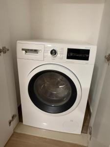 The accommodation comprises one bedroom with a bed, a fully equipped kitchen for cooking needs, and one bathroom. Guests will find additional conveniences such as a washing machine, air conditioning, and a flat-screen TV.