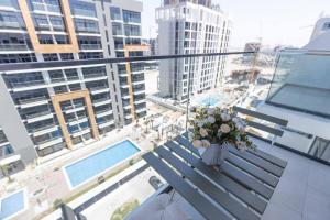Апартаменты Azizi Riviera 42 - Meydan от Golden Casa с кондиционером и собственным бассейном расположены в Дубае, всего в 10 км от фонтана Дубая. В квартире имеется одна комната, предоставляется бесплатный Wi-Fi и бесплатная частная парковка. Гости могут наслаждаться видом с балкона.