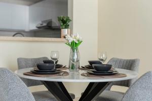Im Apartment finden Gäste ein Schlafzimmer mit schallisolierten Wänden und einem Flachbildfernseher vor. Die voll ausgestattete Küche umfasst moderne Annehmlichkeiten wie Backofen, Mikrowelle, Kühlschrank, Toaster, Wasserkocher sowie Küchenutensilien. Weitere Ausstattungsmerkmale sind Waschmaschine, Bügeleisen mit Bügelbrett, Kleiderschrank, Wäscheständer sowie Bettwäsche und Handtücher.