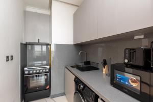 L’appartamento climatizzato presenta una camera da letto con un letto singolo, soggiorno separato arredato con divano e scrivania, oltre ad angolo cottura completo di forno, microonde, piano cottura, frigorifero, tostapane, bollitore elettrico e utensili da cucina. Il bagno è dotato di doccia walk-in senza gradini, bidet e articoli da toilette gratuiti come sapone per il corpo e asciugacapelli. Sono forniti asciugamani e lenzuola insieme alle attrezzature per stirare quali ferro da stiro e asse.