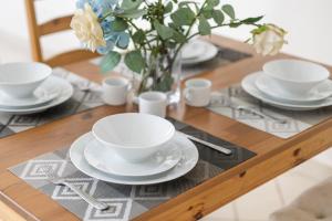 Apartmán má dvě pohodlné postele ve dvou ložnicích a dvě koupelny vybavené vanou, sprchovým koutem, bidetem, vysoušečem vlasů a bezplatnými toaletními potřebami jako mýdlo na tělo a šampon. Plně vybavená kuchyň zahrnuje lednici, troubu, varnou desku, mikrovlnnou troubu, toustovač i jídelní stůl pro domácí stravování. Další vybavení zahrnuje klimatizaci, žehlící prkno s žehličkou i sušičku prádla kombinovanou s pračkou.