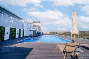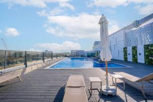 Guests benefit from free Wi-Fi coverage throughout the apartment and complimentary parking on site. The property also offers an outdoor rooftop swimming pool alongside a fitness centre for wellness activities. Safety features include fire extinguishers within the unit while outdoor furniture enhances relaxation on the patio.