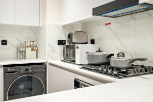Das Apartment bietet ein Schlafzimmer mit einem Bett sowie eine voll ausgestattete Küche mit Backofen, Mikrowelle, Herdplatte, Kühlschrank, Toaster, Kaffeemaschine und Wasserkocher sowie Tee- und Kaffeezubehör. Das Badezimmer ist mit Hausschuhen und Bidet ausgestattet und stellt Shampoo, Conditioner sowie Duschgel für den Komfort der Gäste bereit. Weitere Annehmlichkeiten sind Klimaanlage, Bügeleisen, Sofasitzbereiche, Safe sowie eine Waschmaschine.