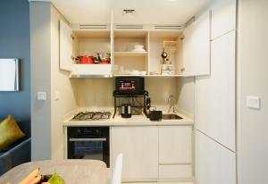 Квартира с кондиционированием включает одну спальню с одной кроватью, гостиную зону с диваном и местами для сидения, а также ванную комнату с ванной и душем. В числе удобств — халаты, тапочки, шампунь, кондиционер для волос, мыло для тела, биде, фен и бесплатные туалетные принадлежности. Полностью оборудованная мини-кухня содержит духовку, плиту, микроволновую печь, холодильник, посудомоечную машину кофе-машину тостер электрический чайник а также принадлежности для приготовления чая и кофе вместе со столовой зоной.