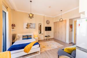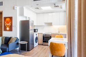 Przestronna kawalerka wyposażona jest w jedno łóżko oraz aneks kuchenny w pełni wyposażony: piekarnik, mikrofalówkę, płytę grzewczą, lodówkę, czajnik elektryczny i naczynia kuchenne. Goście mają do dyspozycji pralkę oraz klimatyzację. W apartamencie znajdują się ręczniki, pościel, żelazko z deską do prasowania, telewizor oraz łazienka wyposażona zarówno w wannę, jak i prysznic.