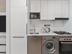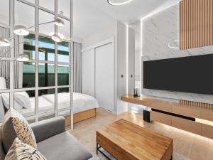 Le studio dispose d’un coin cuisine entièrement équipé comprenant un micro-ondes, un réfrigérateur, une machine à café, une bouilloire électrique, des équipements pour préparer thé et café, une table à manger ainsi que la vaisselle nécessaire. Dans la chambre, les clients bénéficient d’une climatisation individuelle réglable ainsi que du chauffage pour leur confort. Parmi les autres équipements figurent le linge de lit, les serviettes, un fer à repasser, un coffre-fort individuel, un étendoir ainsi qu’une armoire ou penderie. L’espace séjour propose des assises incluant un canapé et une télévision écran plat avec chaînes payantes.
