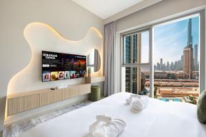 Apartament Downtown Dreams Burj Khalifa View z prywatnym basenem i bezpłatnym parkingiem położony jest w Dubaju, zaledwie 1,2 km od Dubai Mall. Kawalerka obejmuje przestronny pokój z widokiem na miasto oraz dostępem do balkonu.