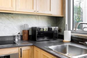 The spacious apartment features one living room, one separate bedroom, and two beds in total. Guests have access to air conditioning, a flat-screen TV, and a washing machine for convenience. The fully equipped kitchen includes modern appliances such as a stovetop, refrigerator, dishwasher, microwave, oven and coffee machine alongside essential kitchenware for dining needs.