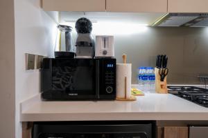 Questo luminoso monolocale comprende un letto ed è dotato di aria condizionata, bagno privato e lavatrice per maggiore comodità. Gli ospiti possono preparare i pasti utilizzando l'angolo cottura o la cucina completa fornita.