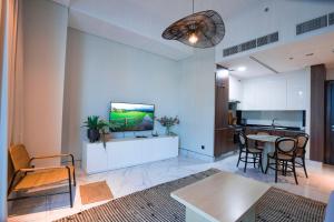 Elegante apartamento de 1 dormitorio en J ONE, ubicado en Dubái, ofrece una piscina privada y aire acondicionado para su comodidad. Este alojamiento cuenta con una habitación con acceso a un balcón y estacionamiento privado gratuito para los huéspedes.