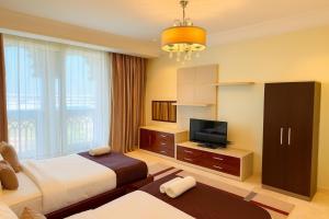 Die elegante 2-Zimmer-Strandwohnung Grandeur Residence, Palm Jumeirah in Dubai liegt 5,2 km vom Aquaventure Waterpark entfernt und bietet ein geräumiges Refugium mit voll ausgestatteter Küche und einem privaten Balkon mit Blick auf den Garten. Die Wohnung verfügt über ein Zimmer mit vier Betten sowie kostenfreies WLAN und private Parkmöglichkeiten.