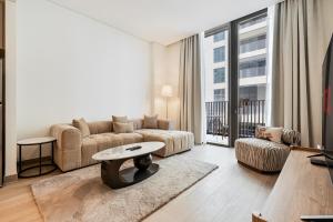 Accommodation includes one bedroom along with a separate living area furnished with a sofa and seating space. The fully equipped kitchen boasts modern appliances such as an oven, stovetop, refrigerator, microwave, coffee machine, toaster and electric kettle alongside kitchenware and a dining table. Additional room amenities include towels and bed linen, air conditioning, clothes drying rack, safety deposit box, wardrobe or closet space, ironing facilities including iron and board as well as a washing machine.
