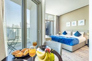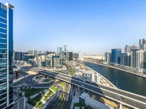 Das klimatisierte Apartment Elegant Studio Business Bay - Balkon mit Skyline-Blick in Dubai verfügt über einen privaten Pool und einen Balkon mit Aussicht auf die Skyline. Die Unterkunft besteht aus einem Zimmer und bietet Blick auf die Stadt sowie den Pool. Die Dubai Fountain liegt nur 2,2 km entfernt und ist bequem erreichbar.