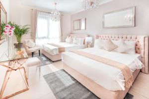 L’alloggio comprende due camere da letto arredate con tre letti in totale, oltre a due bagni dotati di docce walk-in e set cortesia gratuiti. La cucina completamente attrezzata include forno, piano cottura, microonde, lavastoviglie, frigorifero, macchina per caffè e angolo tè. Tra i comfort aggiuntivi ci sono aria condizionata regolabile individualmente in ogni ambiente, zona soggiorno, divano, scrivania da lavoro, ferro da stiro con asse, stendibiancheria, armadio, cuscini anallergici, possibilità di lettino o culla per bambini.