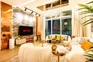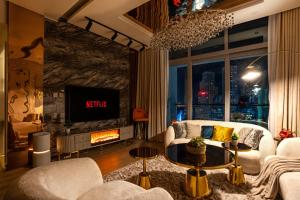 À l’intérieur de l’appartement, les invités disposent de trois salles de bains équipées de peignoirs, chaussons et d’articles de toilette offerts comprenant shampooing et après-shampooing ainsi que baignoires et douches. L’espace séjour présente des parquets en bois dur, des murs insonorisés, une cheminée, un coin salon et des rangements pour vêtements. Parmi les autres équipements figurent la climatisation individuelle, un fer avec planche à repasser, un coffre-fort ainsi qu’un bureau.