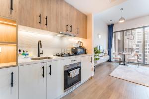 Das Studio ist mit einem Bett ausgestattet und besitzt eine voll ausgestattete Küche mit Kochfeld, Kühlschrank, Backofen, Toaster, Kaffeemaschine sowie Tee- und Kaffeezubereitungsmöglichkeiten. Für Komfort sorgt Klimaanlage, zu den weiteren Annehmlichkeiten im Zimmer zählen Waschmaschine, Kleiderschrank, Sitzbereich, Essbereich und Flachbildfernseher. Schalldichte Wände ermöglichen erholsamen Aufenthalt, zudem sind Bügeleisen, Safe und Wäscheständer vorhanden.