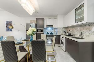 Le logement dispose de deux salles de bains avec douche et bidet. Les hôtes apprécieront le coin cuisine entièrement équipé comprenant four, micro-ondes, plaque de cuisson, réfrigérateur, machine à café, grille-pain, bouilloire électrique ainsi qu’une table à manger. Parmi les équipements complémentaires figurent une télévision écran plat, un canapé, un lave-linge et un bureau avec coffres-forts pour vos objets précieux.