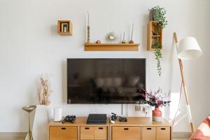 Die elegante Wohnung umfasst ein Schlafzimmer mit einem Bett und Klimaanlage für hohen Komfort. Den Gästen steht eine voll ausgestattete Küche mit Backofen, Mikrowelle, Toaster, Kaffeemaschine sowie elektrischer Teekanne zur Verfügung. Eine Waschmaschine ergänzt den Wohnbereich zusammen mit Sofa und Bügeleisen für zusätzlichen Komfort.