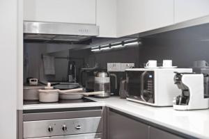 Das klimatisierte Apartment verfügt über ein Schlafzimmer mit einem Bett, eine voll ausgestattete Küche inklusive Kochnische und kompletter Küchenausstattung sowie ein privates Badezimmer. Zur Ausstattung im Zimmer gehören außerdem eine Waschmaschine und ein Flachbildfernseher.