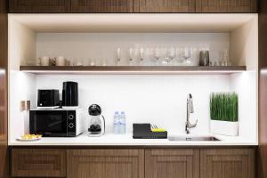 Uvnitř klimatizovaného apartmánu je jedna ložnice spolu s obývacím pokojem a koupelnou se sprchovým koutem. K dispozici jsou také toaletní potřeby zdarma včetně šamponu a kondicionéru, pantofle, tělové mýdlo, vysoušeč vlasů a WC zařízení. Plně vybavený kuchyňský kout nabízí troubu, varnou desku, mikrovlnnou troubu, myčku nádobí, lednici i kávovar spolu se všemi potřebnými kuchyňskými doplňky pro pohodlnou přípravu jídel.