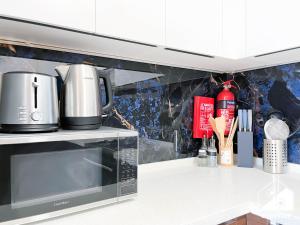 La cuisine entièrement équipée comprend un four traditionnel et micro-ondes combinés (four micro-onde), une plaque de cuisson, un grille-pain, un réfrigérateur, une bouilloire électrique et tout le nécessaire pour cuisiner autour d’une table repas. Parmi les autres équipements figurent un ascenseur desservant directement l’étage de l’appartement ainsi qu'un extincteur incendie, détecteurs fumée et monoxyde de carbone. Vous bénéficiez aussi d'une entrée privée ainsi que du stationnement sur place avec parking gratuit.