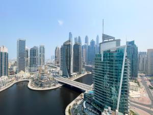 RH - Marina View Getaway, Apartamento espacioso de un dormitorio con terraza en Dubai Marina ofrece alojamiento con aire acondicionado y piscina en la azotea. Este amplio apartamento cuenta con una habitación y acceso a una terraza amueblada, además de aparcamiento privado gratuito.