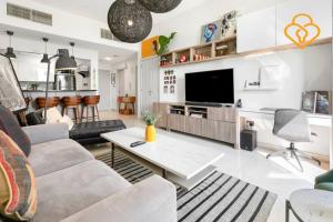 Inside the apartment, guests will find one bed along with a fully equipped kitchen that includes a refrigerator for cooking and food storage. Additional room amenities include air conditioning, an iron, a washing machine, and a work desk. A baby cot or crib can be provided on request. The bathroom features a hairdryer for added comfort.