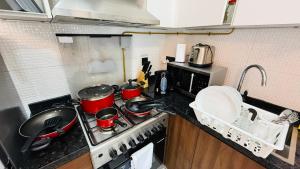 Guests have use of a fully equipped kitchen complete with refrigerator, oven, microwave toaster electric kettle tea and coffee making facilities plus kitchenware. Services include free parking both onsite and garage options, lifts provide access to upper floors where the unit is located. Safety features such as smoke detectors carbon monoxide detectors fire extinguishers are installed within the apartment.