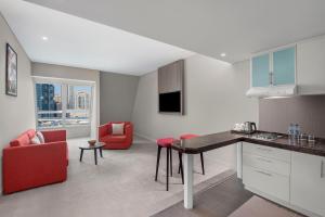 El hotel y suites Leva, de 4 estrellas, se encuentra frente al Downtown Dubai a lo largo de Sheikh Zayed Road y cuenta con una piscina exterior y un gimnasio bien equipado. Este aparthotel ofrece 226 habitaciones y suites contemporáneas con cocina americana, desde estudios hasta amplias suites de uno a tres dormitorios, muchas con vistas al Burj Khalifa.