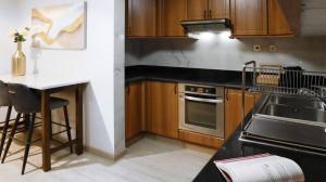 Apartament dysponuje oddzielną sypialnią, salonem z telewizją kablową oraz łazienką wyposażoną w wannę spa i suszarkę do włosów. W pełni wyposażony aneks kuchenny zawiera niezbędne przybory kuchenne, płytę grzewczą, lodówkę, mikrofalówkę, toster, czajnik elektryczny oraz zestaw do parzenia kawy i herbaty. Dodatkowe udogodnienia obejmują klimatyzację, szafę garderobianą, pralkę oraz rozkładaną sofę, ręczniki i pościel są również zapewnione.