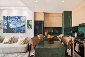El alojamiento consta de un dormitorio equipado con almohadas sintéticas hipoalergénicas y ropa de cama. La cocina americana totalmente equipada dispone de placa eléctrica, nevera, horno, microondas, además de facilidades para preparar té y café junto con secadora. Los huéspedes cuentan también con aire acondicionado, calefacción, escritorio para trabajar, lavadora y cuna disponible bajo petición. El baño privado incluye jabón corporal, champú y secador de pelo.