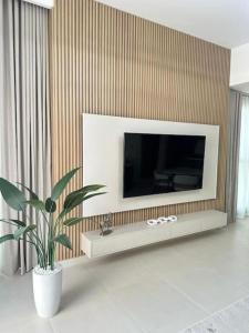 Im Inneren umfasst das Apartment zwei Schlafzimmer, zwei Badezimmer sowie eine voll ausgestattete Küche zum Zubereiten von Mahlzeiten. Zusätzliche Annehmlichkeiten im Zimmer sind Heizung, Waschmaschine, Babybett-Optionen und ein Flachbildfernseher für mehr Komfort während des Aufenthalts.
