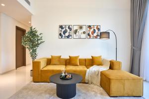 Das luxuriöse 2-Zimmer-Apartment im Grand Bleu Tower am EMAAR Beachfront in Dubai bietet Seeblick und privaten Strandzugang. Die Unterkunft befindet sich nur 4 km von The Walk at JBR entfernt und liegt in einer hohen Etage mit einem Schlafzimmer, insgesamt zwei Zimmern sowie einem Balkon mit beeindruckendem Blick auf die Marina und die Stadt.