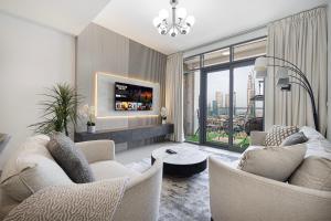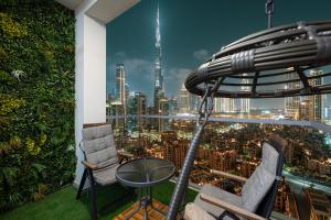 Este amplio apartamento de lujo con 1 dormitorio y 2,5 baños ofrece vistas al Burj Khalifa y acceso a piscina y gimnasio, situado cerca del Dubai Mall en Dubái. Dispone de conexión WiFi gratuita, aire acondicionado con controles individuales y comodidades para el hogar como lavavajillas y cafetera. Desde el balcón se pueden contemplar vistas al jardín, mientras que la terraza da hacia la piscina.