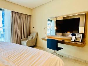 Die luxuriöse 2-Zimmer-Suite im Paramount Hotel and Residences befindet sich im Geschäftsviertel Business Bay in Dubai und bietet eine großzügige Wohnung mit Klimaanlage, Balkon mit Stadtblick sowie einem exklusiven privaten Eingang. Diese Einheit vereint Komfort und Privatsphäre und verfügt über Annehmlichkeiten wie Sauna und Whirlpool.