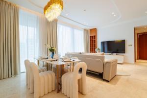 Das Apartment umfasst zwei separate Schlafzimmer, ein Wohnzimmer sowie drei Badezimmer mit Badewannen oder Duschen und Bidet. Die voll ausgestattete Küche verfügt über Backofen, Herdplatte, Geschirrspüler, Kühlschrank und Mikrowelle sowie eine Kaffeemaschine und Tee-Zubereitungsmöglichkeiten. Weitere Annehmlichkeiten im Zimmer sind ein Flachbild-TV mit Kabelkanälen, Waschmaschine, Bügeleisen mit Bügelbrett, Safe und Bettwäsche.