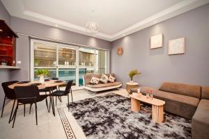 L’alloggio presenta un angolo cottura completamente attrezzato con frigorifero, lavastoviglie, microonde, bollitore elettrico e tavolo da pranzo. L’area living include due letti, TV a schermo piatto e lavatrice oltre a comfort aggiuntivi come stendibiancheria e divano.