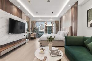 Просторная студия оборудована удобной кроватью и полностью оснащённой мини-кухней с духовкой, плитой, холодильником, посудомоечной машиной, микроволновой печью а также принадлежностями для приготовления чая и кофе. В номере предусмотрены кондиционер, стиральная машина, гладильные принадлежности с утюгом и доской для глаженья, предоставляются полотенца и постельное бельё. Для работы доступен письменный стол.