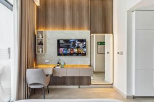 El estudio dispone de una cama y cocina americana totalmente equipada con placa de cocción, nevera, lavavajillas, horno, microondas y utensilios para todas las necesidades culinarias. El aire acondicionado garantiza la comodidad junto con calefacción cuando sea necesario. Entre las comodidades adicionales se incluyen lavadora, escritorio para trabajar, tabla e plancha para ropa, armario o ropero, caja fuerte para objetos de valor así como ropa blanca que incluye toallas y sábanas. El baño privado ofrece bañera y ducha además de artículos gratuitos como champú y acondicionador.