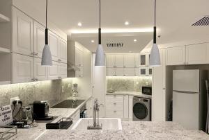 W pełni wyposażony aneks kuchenny zawiera piekarnik, płytę grzewczą, mikrofalówkę, zmywarkę, lodówkę oraz ekspres do kawy. Dla wygody gości przygotowano również żelazko i deskę do prasowania, pralkę ze stojakiem na suszenie ubrań, sejf oraz biurko do pracy.