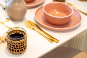 Das Apartment ist mit einer voll ausgestatteten Küche ausgestattet, die Backofen, Geschirrspüler, Kühlschrank, Mikrowelle sowie Kaffee- und Teezubereitungsmöglichkeiten umfasst. Zur weiteren Ausstattung gehören Bügelutensilien (Bügeleisen und Bügelbrett), Handtücher, Klimaanlage und ein Wäscheständer für zusätzlichen Komfort.