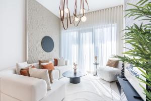 Inside, the apartment features two bedrooms and three bathrooms equipped with walk-in showers and bathtubs. The fully fitted kitchen boasts a stovetop, refrigerator, dishwasher, oven, microwave, toaster, electric kettle and tea and coffee making facilities alongside a dining table for meals at home. Additional comforts include air conditioning throughout, a flat-screen TV, washing machine, sofa seating area and baby cot availability.