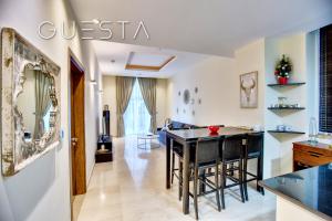 Apartament składa się z jednej sypialni oraz dwóch łazienek wyposażonych w wannę, prysznic, bidet, bezpłatne kosmetyki i suszarkę do włosów. Do dyspozycji gości jest salon typu open space umeblowany rozkładaną sofą i telewizorem z płaskim ekranem oraz wyposażony aneks kuchenny obejmujący zmywarkę, piekarnik, płytę grzewczą, mikrofalówkę, ekspres do kawy i pełne zaplecze jadalne. Dodatkowe udogodnienia w pokoju to indywidualnie sterowana klimatyzacja, zestaw do prasowania wraz z deską i żelazkiem oraz pościel i ręczniki, cały obiekt jest dostosowany do potrzeb osób na wózkach inwalidzkich.