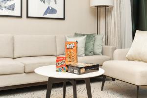 Die Wohnung verfügt über eine voll ausgestattete Küche mit Backofen, Herdplatte, Mikrowelle, Kühlschrank, Kaffeemaschine und Toaster. In den drei Badezimmern befinden sich jeweils begehbare Duschen oder Badewannen sowie kostenlose Pflegeprodukte. Weitere Ausstattungsmerkmale sind schallisolierte Räume für Privatsphäre, Waschmaschine, Safe, Bügeleisen samt Bügelbrett, allergikerfreundliche Kissen (ohne Daunen), Heiz- und Kühlsysteme. Ein Arbeitsplatz sowie ein Sofa sorgen im teppichbedeckten Wohnbereich für zusätzlichen Komfort.