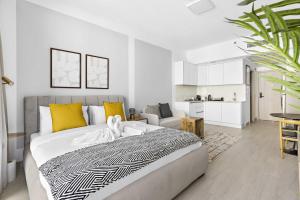 Lo studio è dotato di un letto e di un angolo cottura completamente attrezzato con forno, microonde, piano cottura, frigorifero, bollitore elettrico e utensili da cucina. Tra i comfort aggiuntivi figurano aria condizionata, biancheria per la casa, ferro da stiro con asse da stiro, asciugamani e lavatrice. Il bagno privato è completo di shampoo e asciugacapelli.