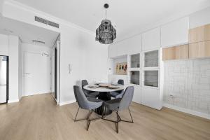 Przestronne mieszkanie obejmuje jedną sypialnię oraz dwie łazienki wyposażone w wannę, prysznic i bidet, a także saunę dostępną w pokoju. Goście mają do dyspozycji klimatyzowany salon z telewizorem z płaskim ekranem, częścią wypoczynkową, biurkiem do pracy i sejfem. W pełni wyposażony aneks kuchenny zawiera lodówkę, płytę grzewczą, piekarnik, zmywarkę, mikrofalówkę oraz ekspres do kawy wraz z zestawem do parzenia herbaty i kawy.