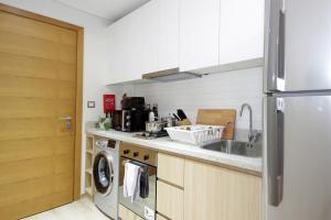 Студия оборудована полностью оснащённой мини-кухней с электрическим чайником, кофемашиной, тостером, микроволновой печью и холодильником, а также столом для приёма пищи. Для удобства гостей предусмотрены стиральная машина и сушилка для одежды, гладильные принадлежности — утюг и сушилка для белья. Ковровое покрытие пола сочетается с кондиционером для создания комфортной атмосферы на протяжении всего пребывания.